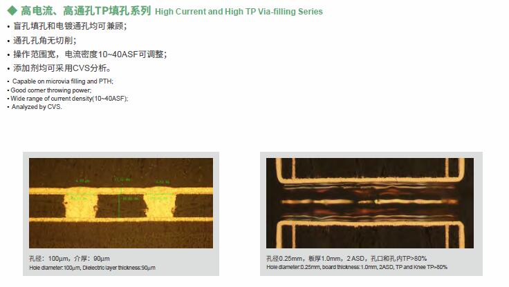 VFP系列是我司新一代填孔藥水,其中VFP08適用于不溶性陽極電鍍填孔,VFP08S適用于可溶性陽極電鍍填孔,均可用于孔徑2~6mil的盲孔填孔,且可達到較薄面銅,適應精細線路的生產,VFP21適用于盲孔填孔和通孔同時電鍍。
