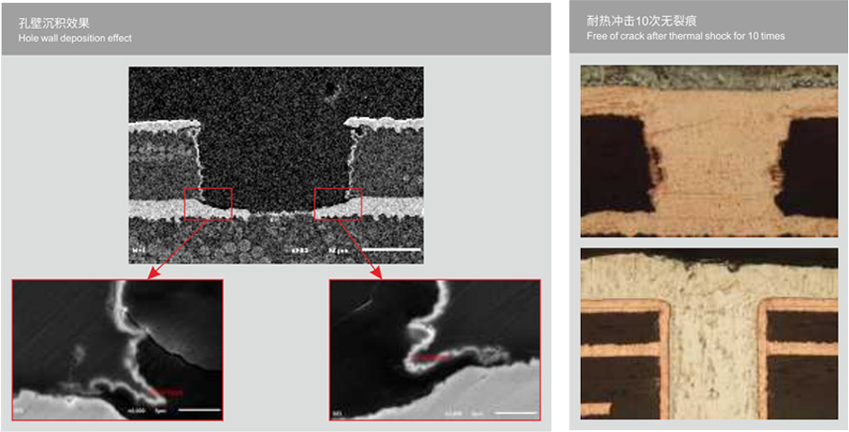 TS-ECuSet系列是應用于水平線的中低溫化學沉銅,堿性離子鈀活化體系,能夠快速再樹脂和玻纖構成的孔壁上進行均勻、致密且穩(wěn)定的化學沉銅層。